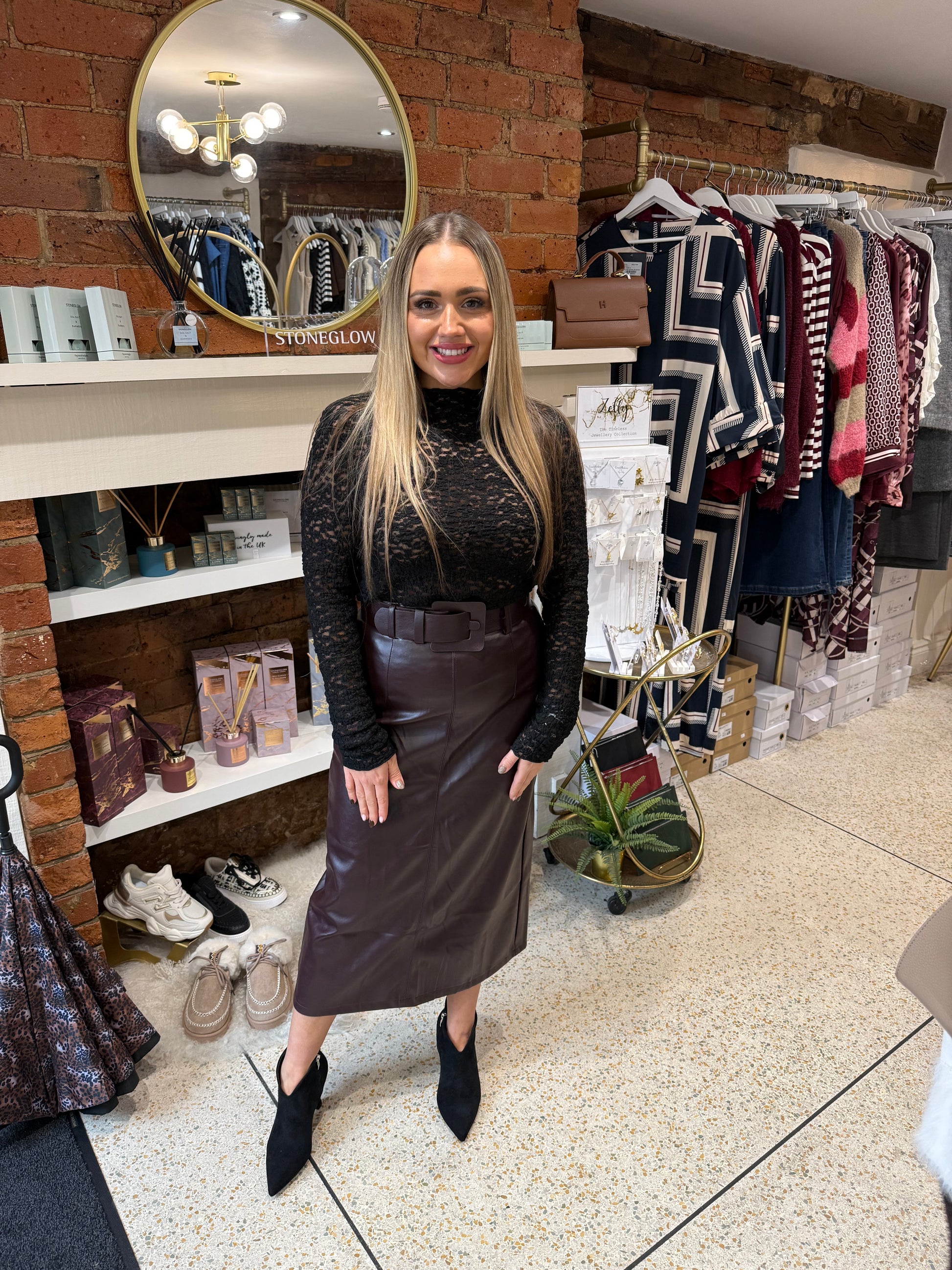 Burgundy Leather Midi Skirt